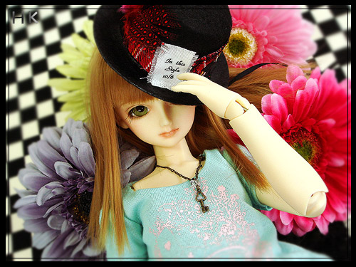 チェス盤みたいな背景に、帽子屋の帽子を被って、鍵のネックレスをかけて、にゃんこな手。